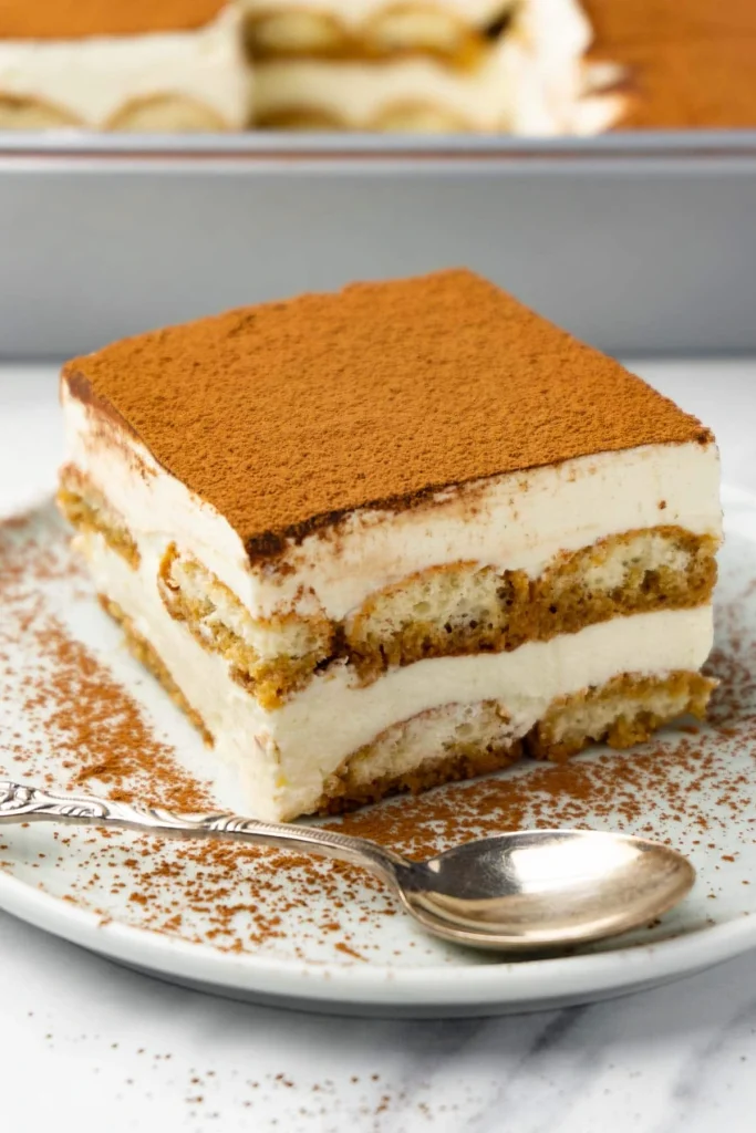 - پس از خنک شدن، تیرامیسو را از یخچال خارج کنید و بهصورت مربعی یا مستطیلی برش دهید.