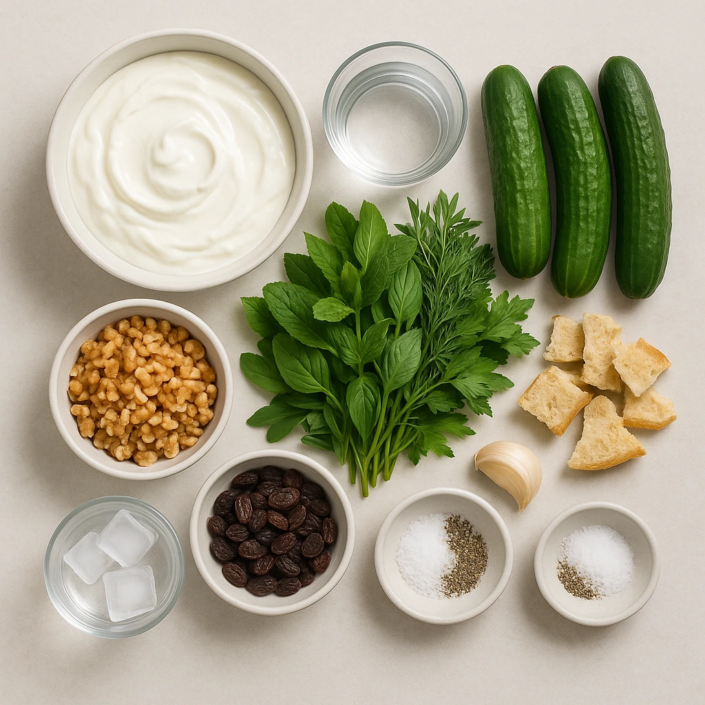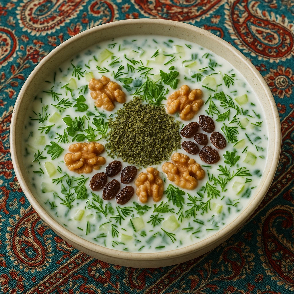 - تزئین: میتوانید روی آبدوغخیار را با گردوی خرد شده، نعناع خشک یا برشهای خیار تزئین کنید.