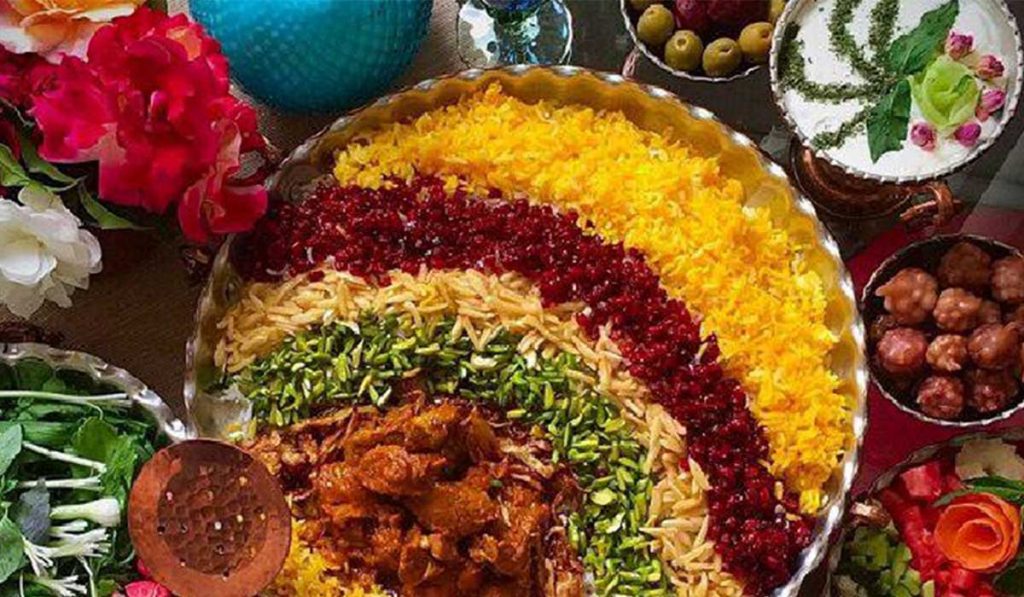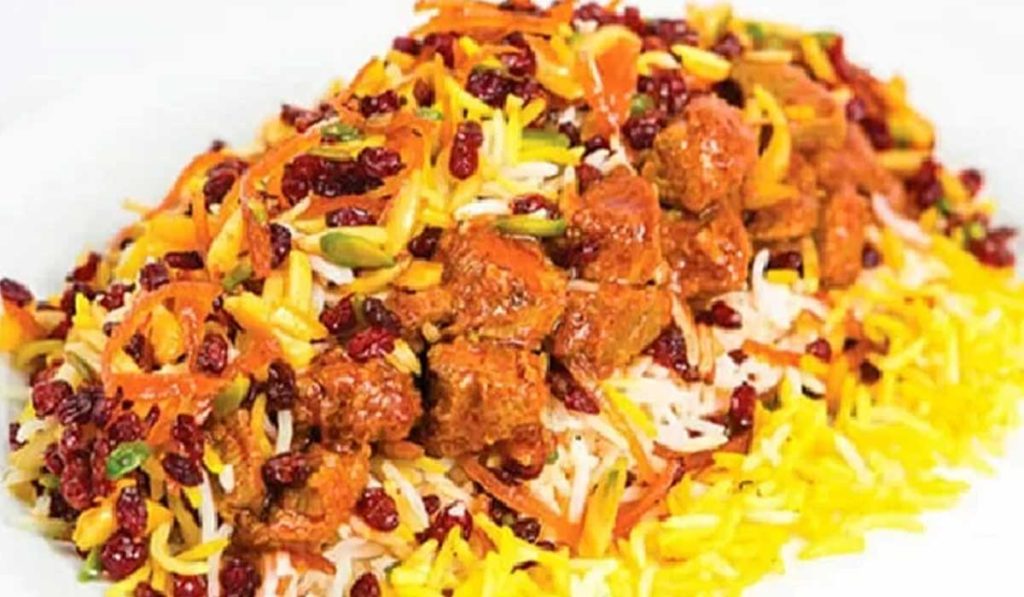 در همین حین، خلال‌های بادام و پسته را جداگانه در روغن تفت می‌دهیم تا کمی طلایی شوند. زرشک را نیز با کمی شکر تفت می‌دهیم تا طعم ملسی به غذا بدهد. برنج را هم به روش معمول آبکش می‌کنیم.