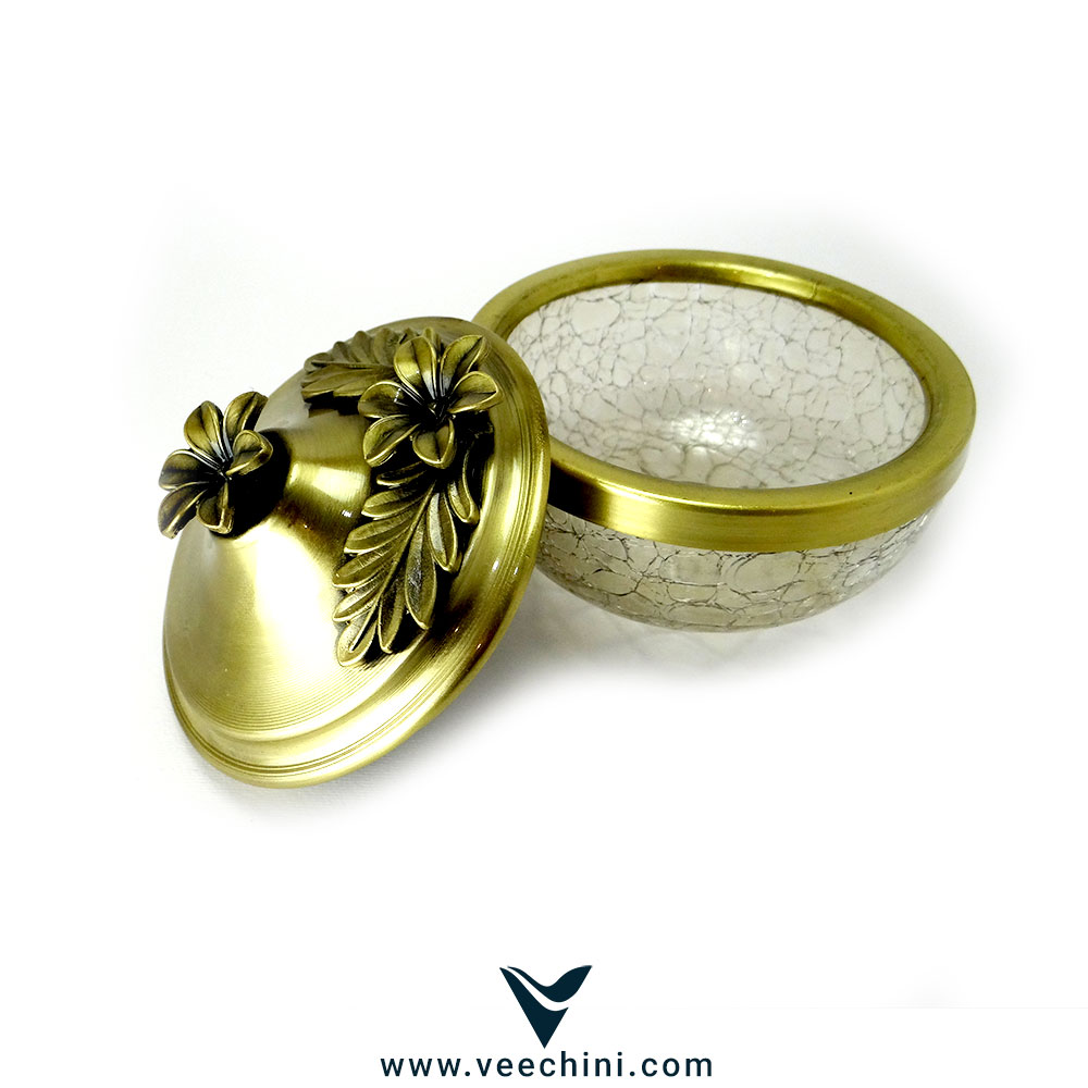 بدنه اصلی از شیشه ترکخورده ساخته شده که الگوی زیبایی از ترکهای ظریف را به نمایش میگذارد. این الگوی طبیعی به هر قطعه شخصیت منحصر به فردی میبخشد. درپوش محصول از برنج آبکاری شده با رنگ طلایی ساخته شده و با گلهای برجسته تزئین شده است که جلوهای کلاسیک و لوکس به آن میدهد.