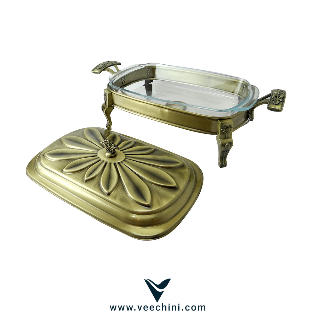 طراحی این سوفله خوری به گونهای است که با طرح گل برجسته روی درب و دستگیرههای طلایی رنگ در دو طرف، جلوهای اشرافی و کلاسیک به آن داده شده است. شیشه پیرکس نشکن به کار رفته در این محصول، امکان مشاهده محتویات را فراهم کرده و در عین حال مقاومت بالایی در برابر ضربه و حرارت از خود نشان میدهد. سیستم گرم نگهدارنده این ظرف با استفاده از شمع طراحی شده که روشی ایمن و کارآمد برای حفظ دمای غذا است.