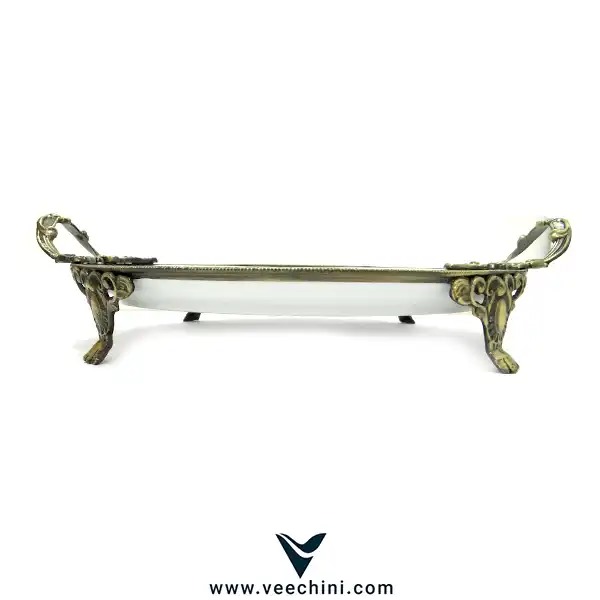 پایهها و دستگیرههای این دیس از برنج میباشد که با لایهای از پوشش ویژه آبکاری شدهاند. این فرآیند نه تنها استحکام فلز را افزایش میدهد بلکه درخشش و ظاهری لوکس به آن میبخشد. این ویژگیها سبب میشود دیس ظاهری همیشه تازه و براق داشته باشد و گزینهای مناسب برای دکوراسیون های لوکس محسوب شود.