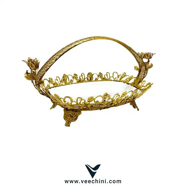 شیرینی خوری طلایی کوئین با طراحی خاص و ظریفش، تلفیقی از هنر سنتی و مدرن را به نمایش می‌گذارد. دسته‌های طلایی با طرح گل در دو طرف ظرف، جلوه‌ای اشرافی به آن بخشیده‌اند. بدنه توری‌مانند با نقوش ظریف اسلیمی، علاوه بر زیبایی بصری، سبکی خاصی به ظرف داده است.