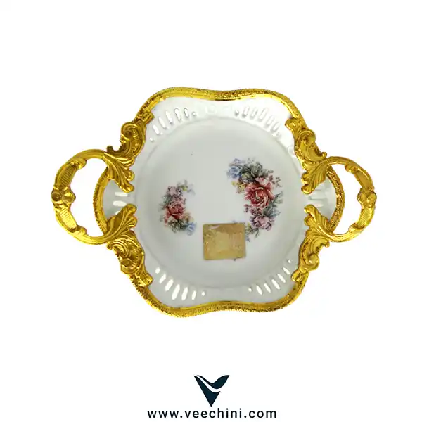 شکلات خوری ویولت VCHI093، با طراحی ظریف و هنرمندانه‌اش، هر بیننده‌ای را مجذوب می‌کند. ترکیب رنگ‌های سفید و طلایی، به همراه نقوش گلدار روی سطح چینی، حس لطافت و زیبایی را به فضای شما می‌آورد. لبه‌های کنگره‌ای ظرف و دسته‌های طلایی‌رنگ، به جذابیت این محصول افزوده‌اند.
