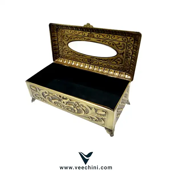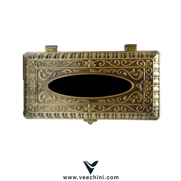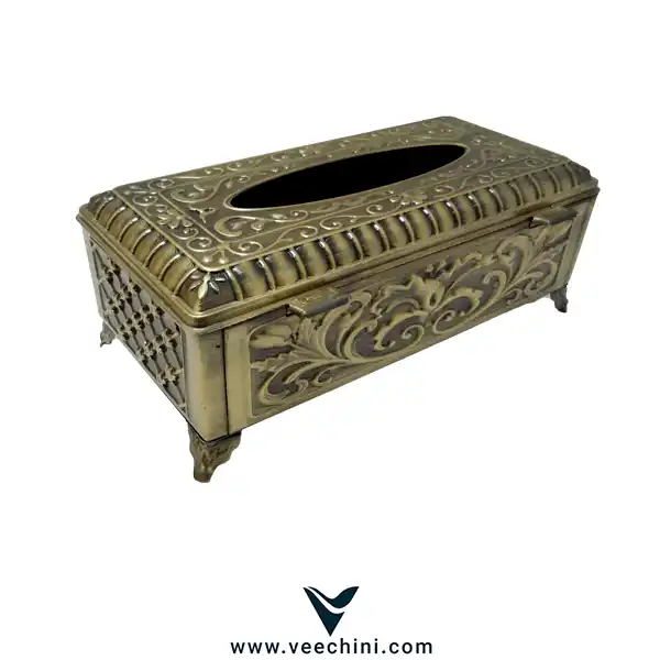 سطح فلزی جا دستمالی با ظرافت و دقت بالا حکاکی شده است. این حکاکیها به شکل گلها و طرحهای پر پیچوخم کلاسیک، حس هنر و اصالت را به نمایش میگذارند.