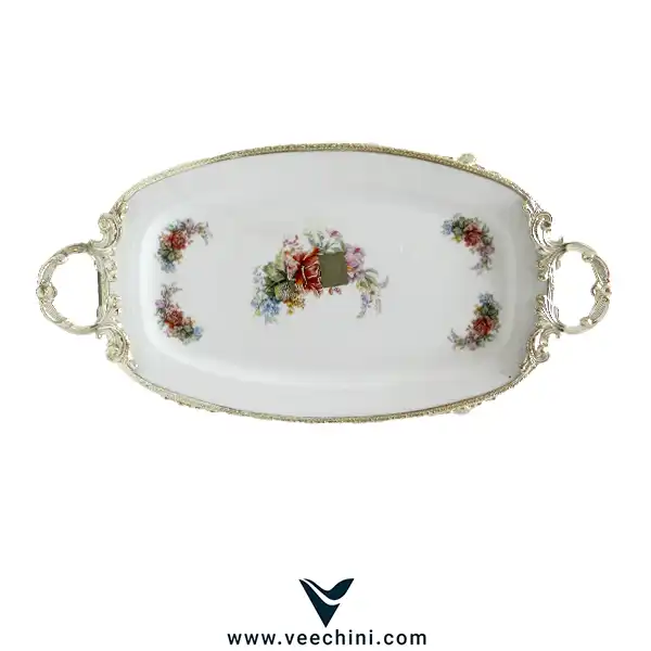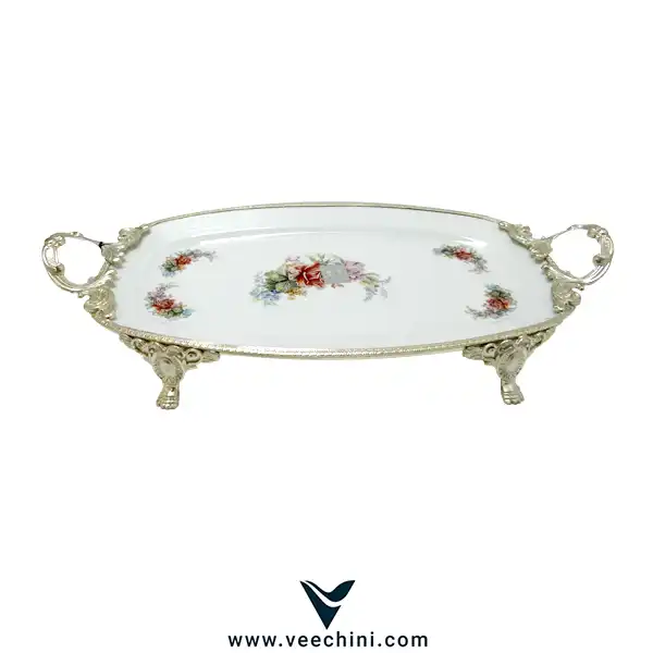 3. سطح سرامیکی: قسمت مرکزی سینی از جنس سرامیک ظریف و مرغوب است که با نقاشیهای زیبا و هنرمندانهای از گلهای رنگارنگ تزئین شده است. این طرحها معمولاً با دست اجرا شدهاند و لطافت و ظرافت خاصی را به محصول میبخشند.