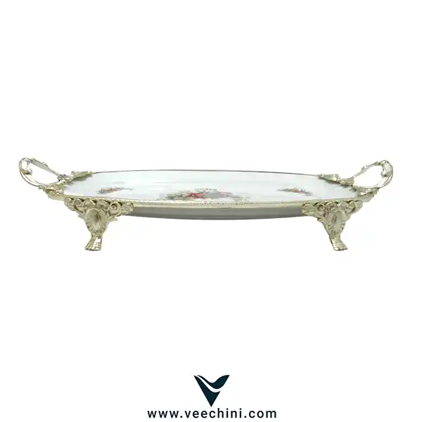 4. لبهها و آراستگی کلاسیک: دور تا دور سینی با تزئینات برجسته و حکاکیهای فلزی با آبکاری نقره پوشش داده شده است که جلوهای لوکس و اصیل ایجاد میکند.