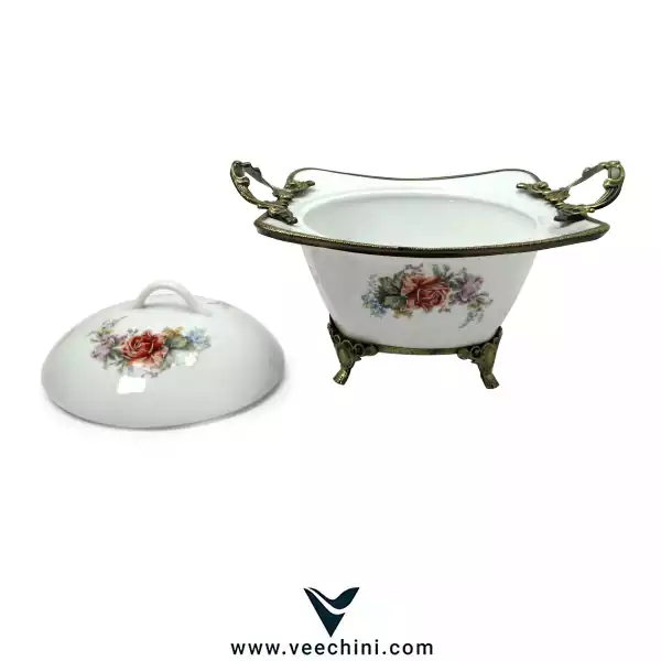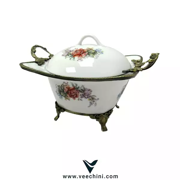 دستههای دو طرف سوپخوری و لبههای آن از فلز برنج ساخته شدهاند که با آبکاری نقرهای یا طلایی جلا داده شدهاند. این قسمتها نه تنها مقاومت مکانیکی ظرف را افزایش میدهند، بلکه به راحتی در دست قرار میگیرند و در حین سرو غذا از سوختن دست جلوگیری میکنند. طراحی دستهها شبیه به شاخ قوچ یا پیچکهایی با الهام از سبک ویکتوریایی انجام شده است.